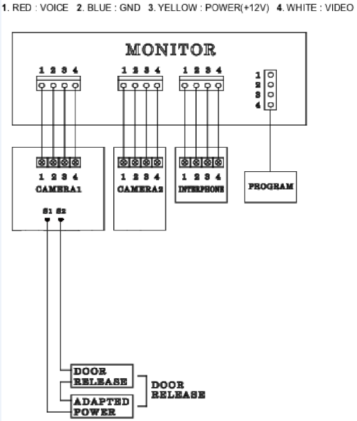 - Cableado de la cámara de la puerta: 4 hilos (polaridad ) Interphone: 4 hilos (polaridad)